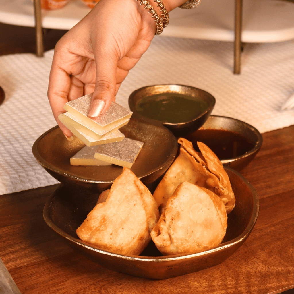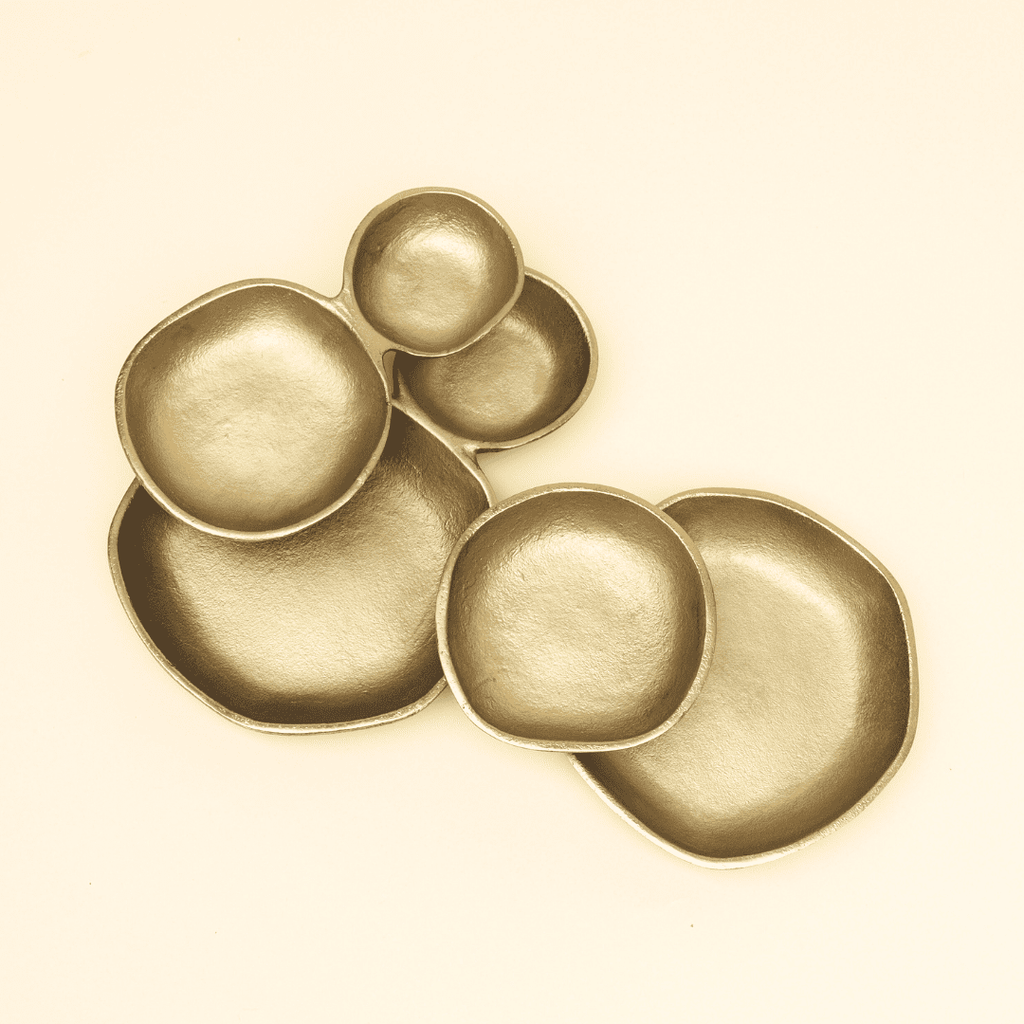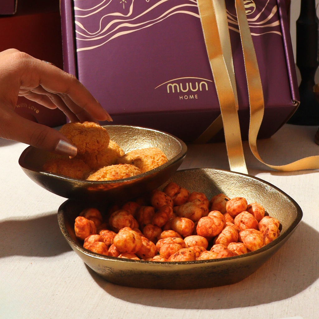 Each bowl's gold finish and textured surface exudes warmth and artisanal character, turning simple servings into thoughtful displays. Crafted responsibly in India, the durable aluminium construction makes them safe for both wet and dry foods, ideal for everyday use.