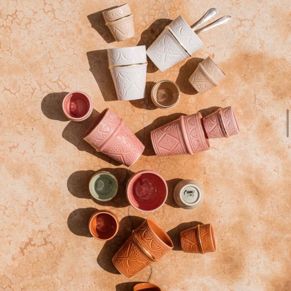 These cups are made and traditionally painted by hand by artisans in Marrakech. Each creation is unique and each cup is adorned with 12-carat gold embellishments.