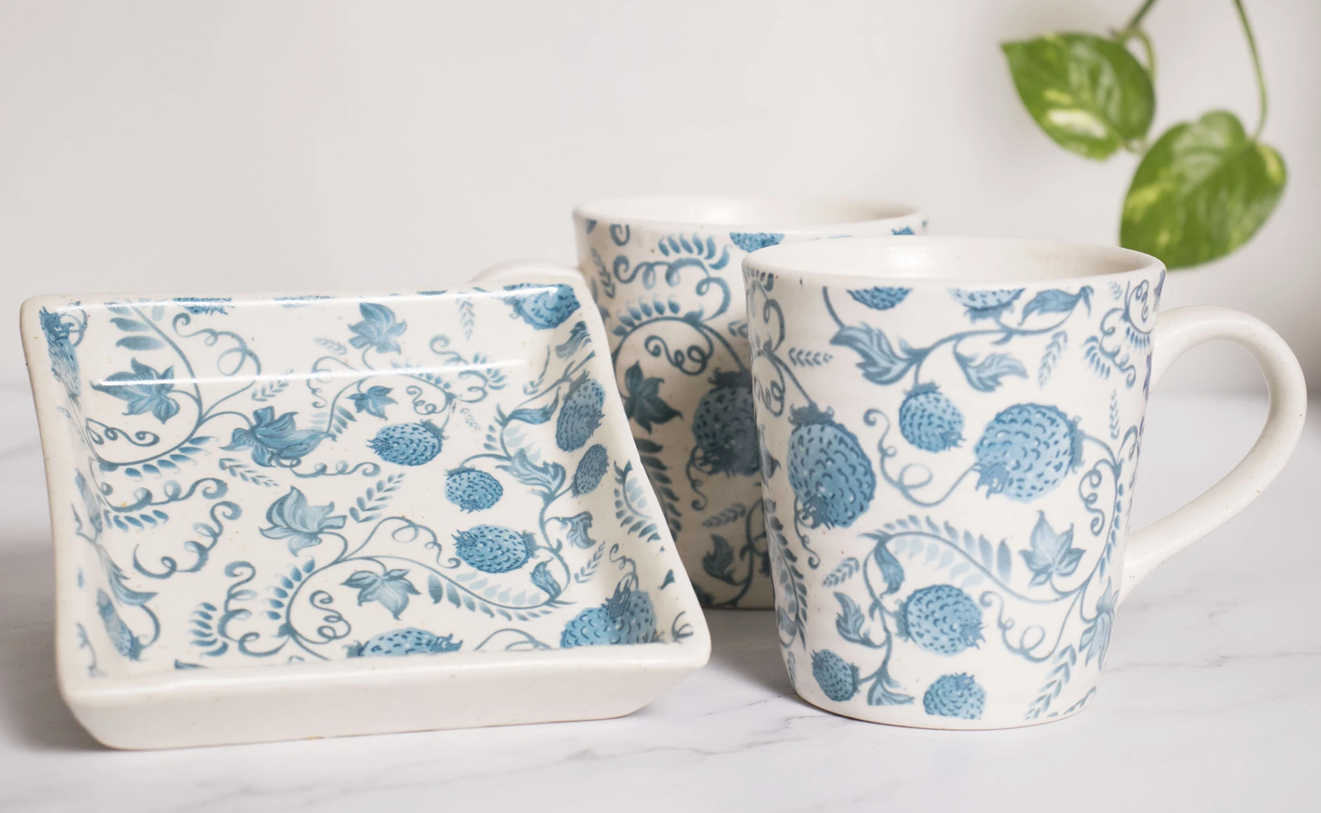 Inspired by the pink city, Jaipur, this bluebell coffee mug set portrays the transition of the city from its chilly winters to a beautiful spring weather. We collaborated with The Table Fable to bring this collection of soothing handmade and hand-painted tableware for you. There may be minor variations in measurement and colour specification from one piece to another as this product is handmade and hand-painted.