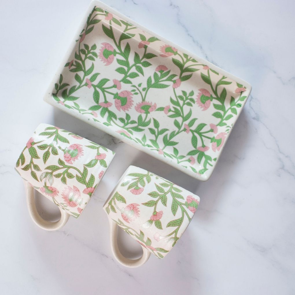 Pink Symphony Coffee Mug Set With 2 Coffee Mugs + Coffee Tray