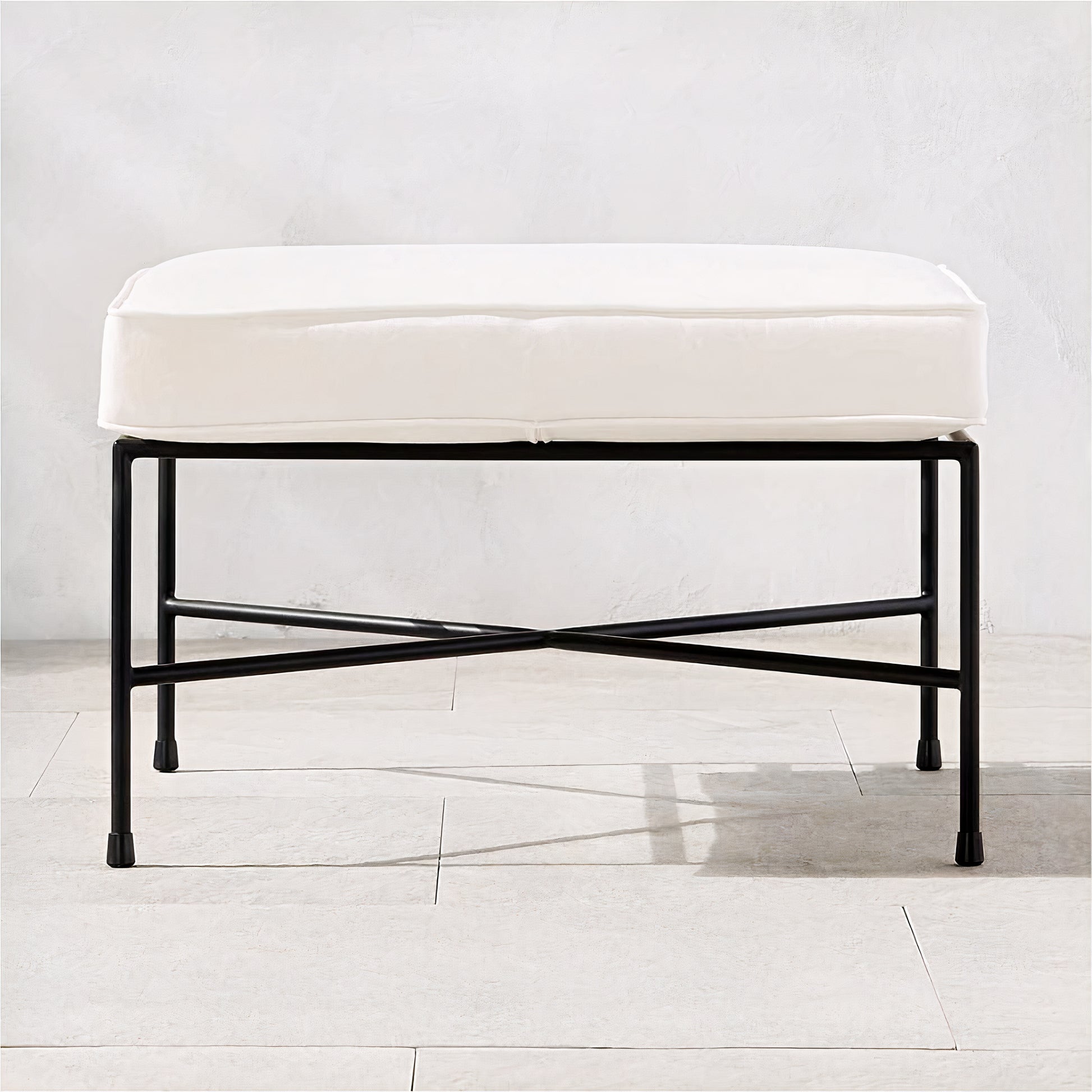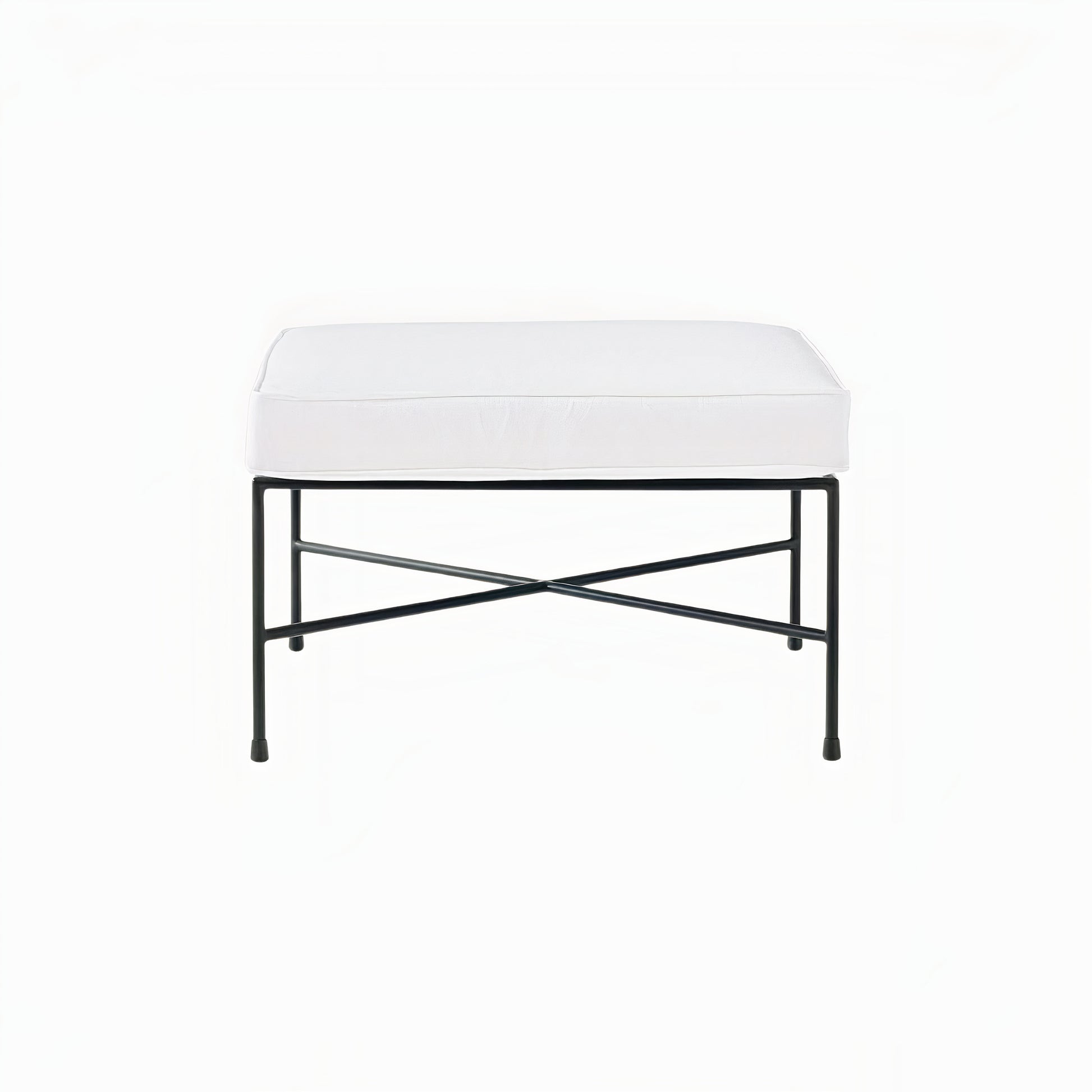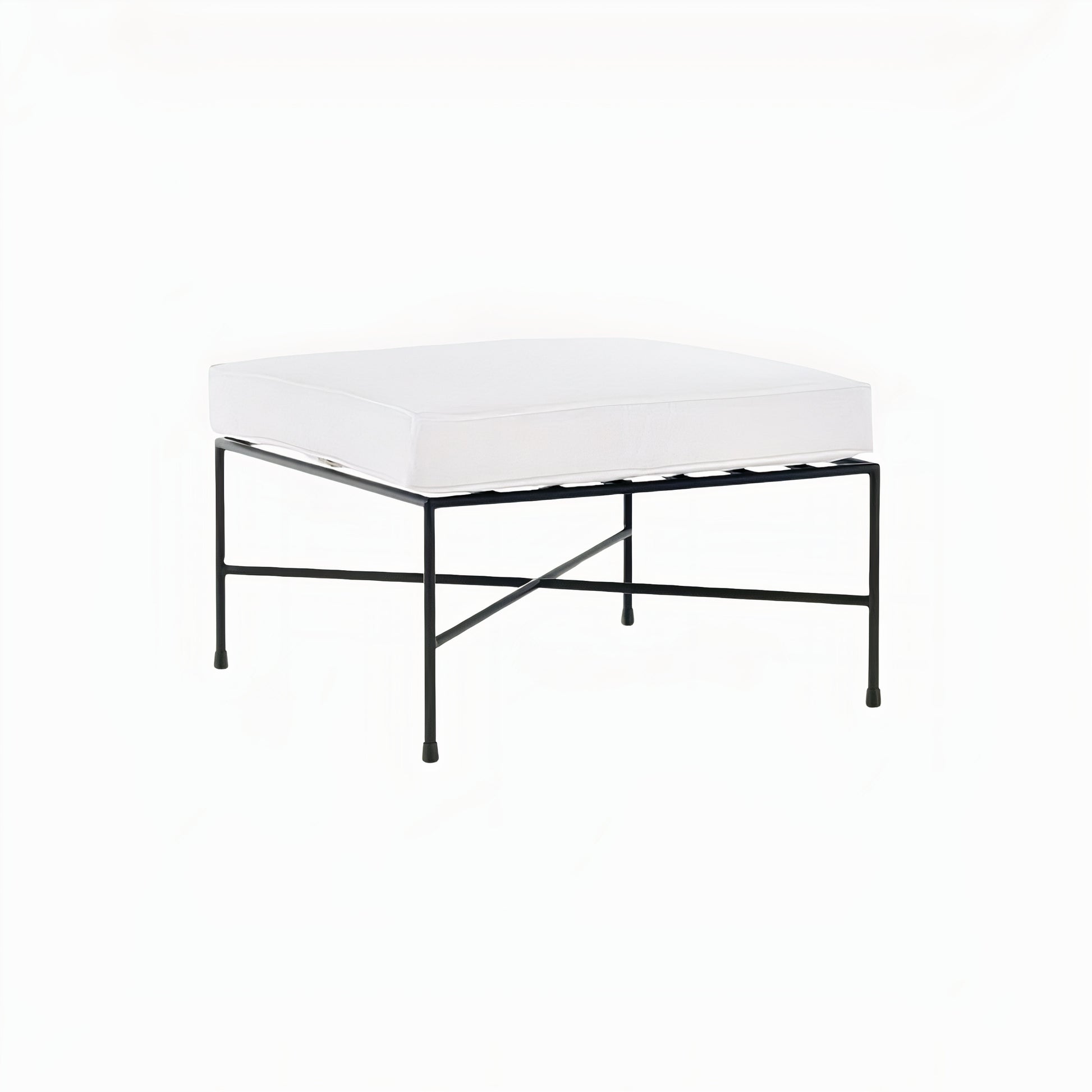 First introduced as part of Paul McCobb's 1952 Pavilion Collection, outdoor ottoman was designed to be durable, beautiful and easy to care for. Solid cast metal frame will stand both the elements and the test of time, as will the cushion in white Sunbrella canvas fabric. This just blends in well with modern outdoor space or even an indoor living room.