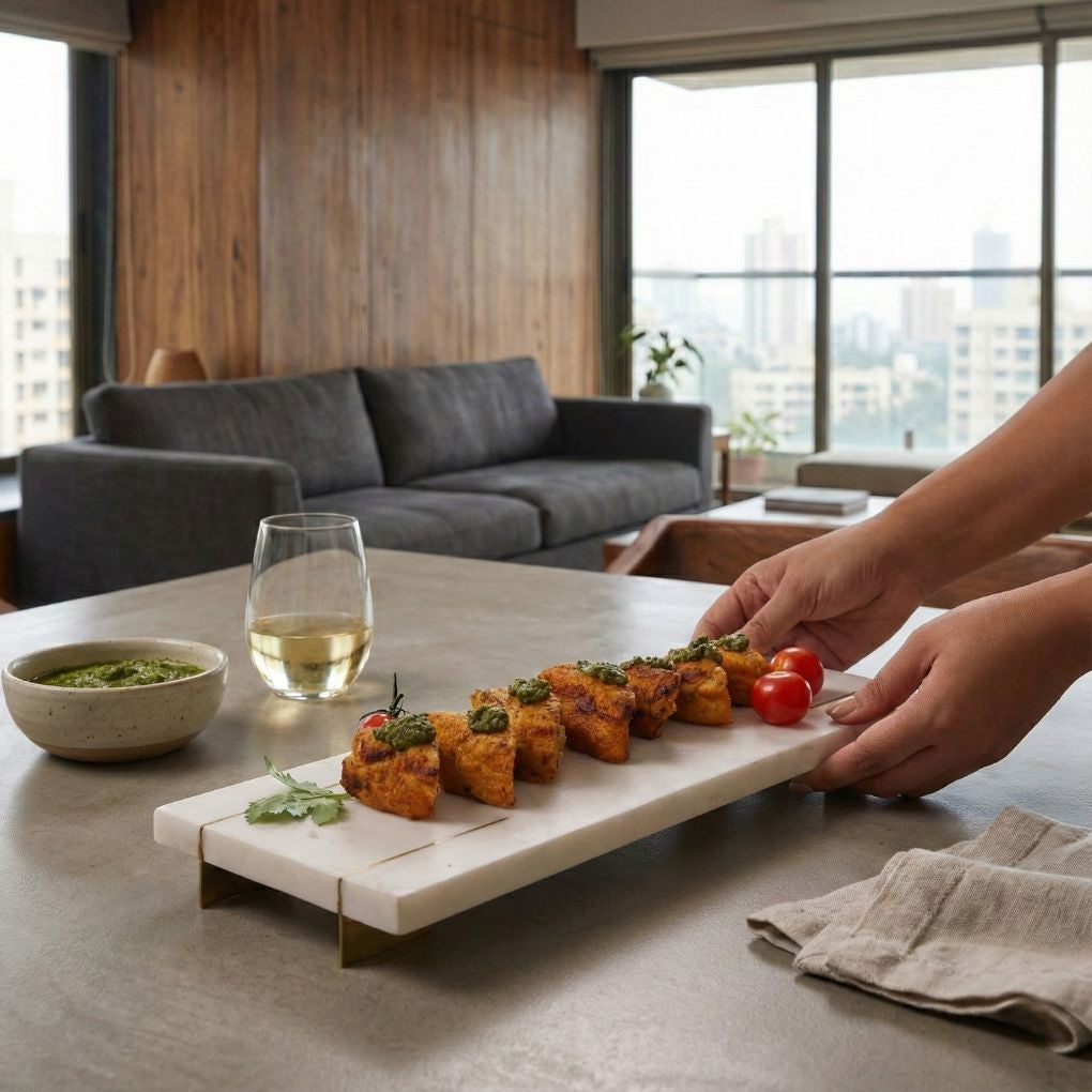 The Art of Entertaining Whether you are curating a charcuterie spread on the moody black surface or presenting artisanal pastries on the pristine white, this marble serving platter elevates every offering. The polished surface keeps cheeses and fruits cool, while the raised brass legs provide a sculptural lift, adding effortless hierarchy to your table setting.