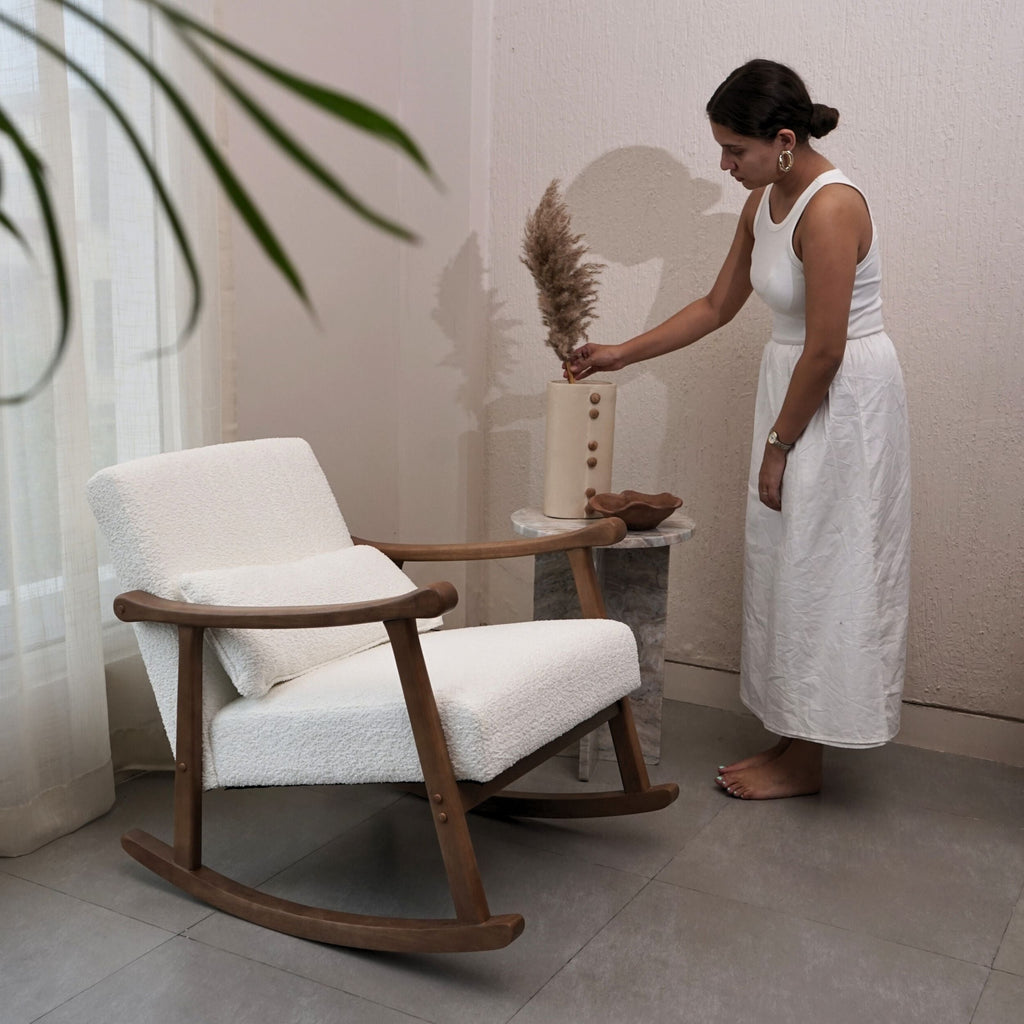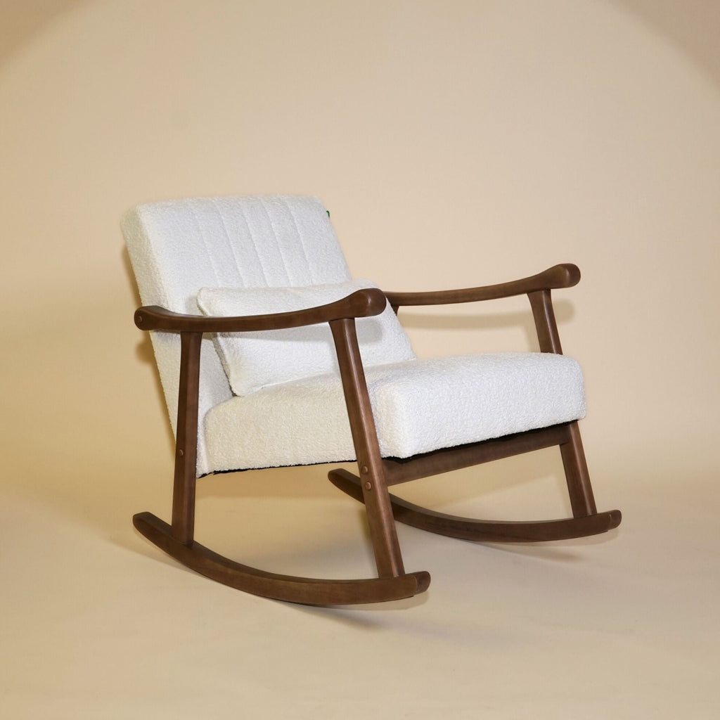 Introducing the Astra Upholstered Boucle Rocking Chair – a luxurious blend of mid-century modern aesthetics and ultimate cozy comfort. Perfect for your relaxed moments in your space.