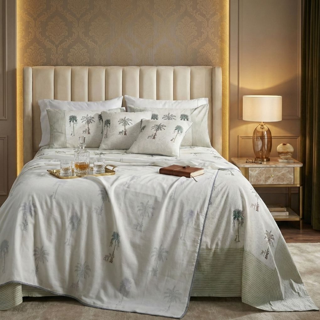 Hand-stamped by artisans using the centuries-old block print technique, the motif features swaying palm silhouettes in a hushed charcoal grey against a canvas of raw, milky cream. It is the perfect visual anchor for a modern bedroom—offering the organic beauty of nature without disrupting your colour palette.