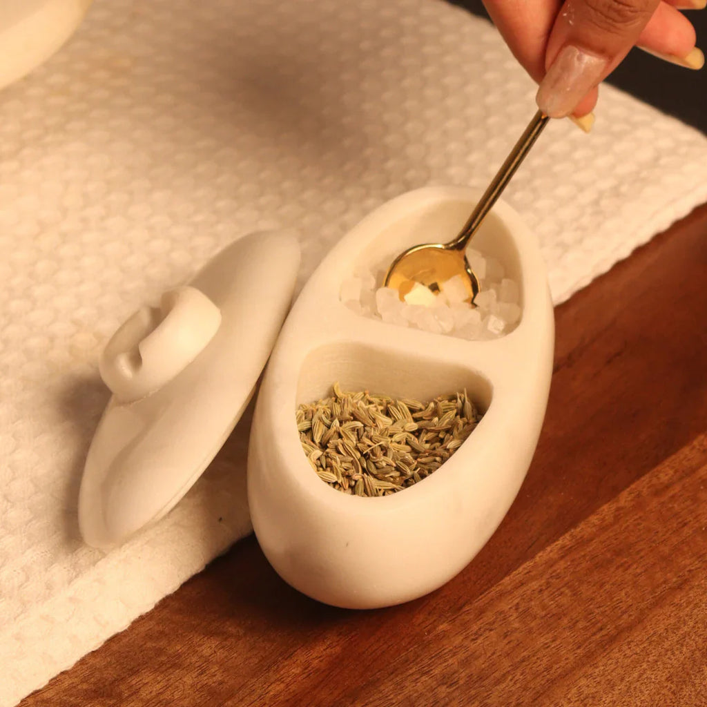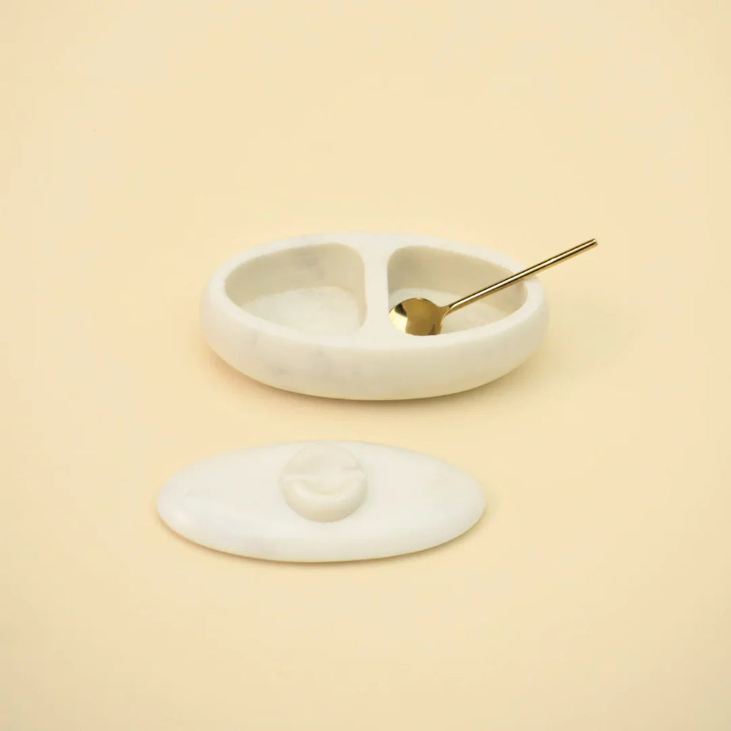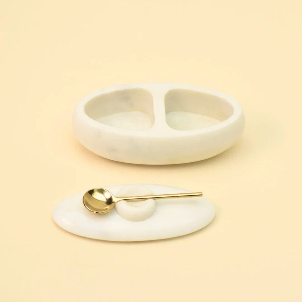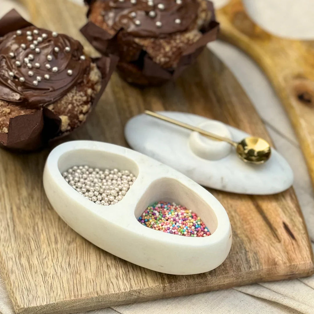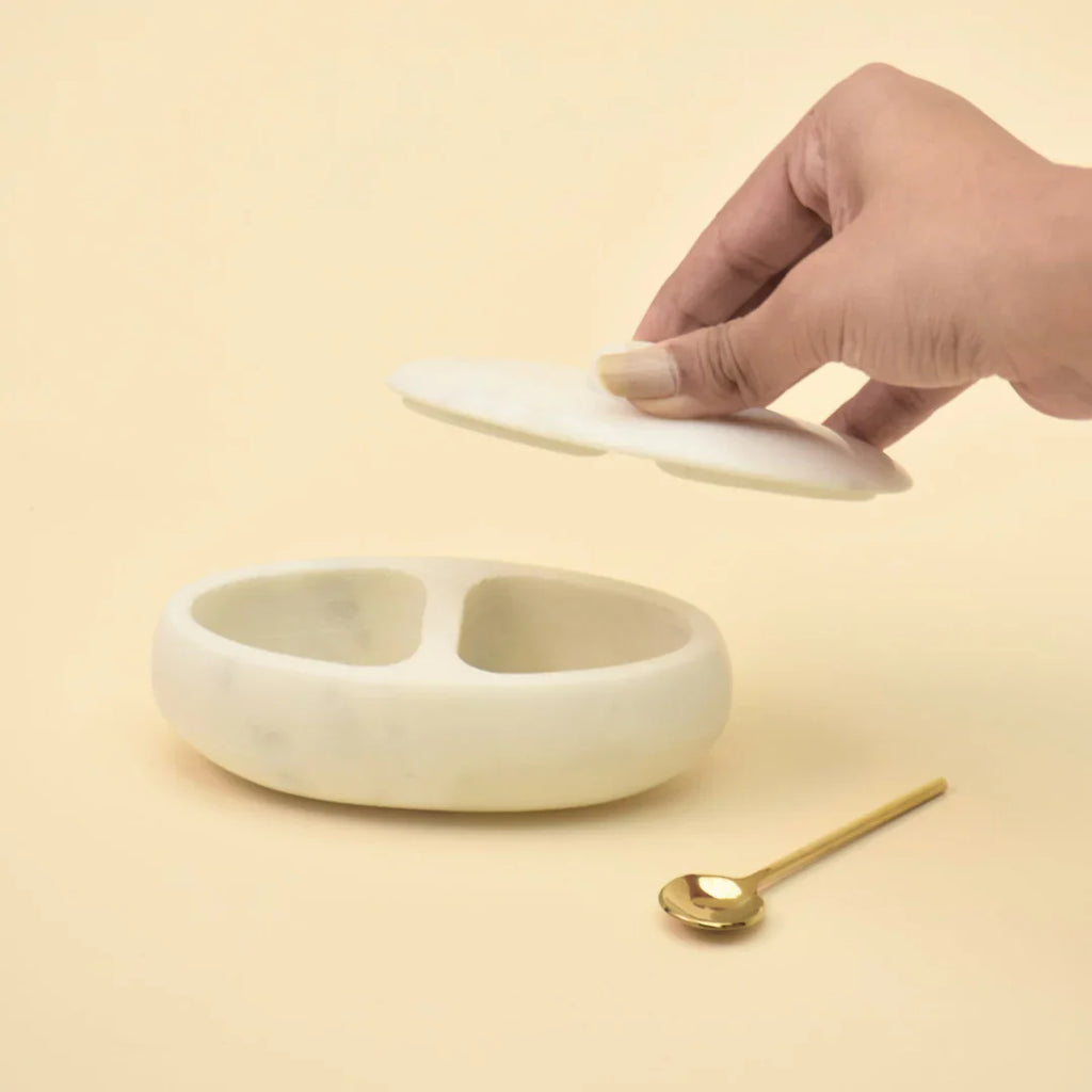 • Compact yet versatile, the design includes two connected marble compartments, perfect for pairing condiments or dips side by side.