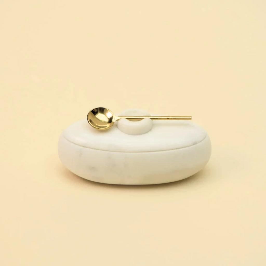 • Comes with a delightful gold spoon that cleverly stores on the lid—so you’ll never misplace it.